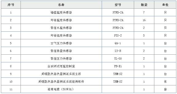 產品組成:墻壁溫度傳感器、環境溫度傳感器、管道水溫傳感器、環境濕度傳感器、空氣壓力傳感器、管道流量傳感器、管道壓力傳感器、全封閉式恒溫控制室、采暖散熱器熱量測試系統主機、采暖散熱器熱量測試系統監測軟件、連接電纜等。
