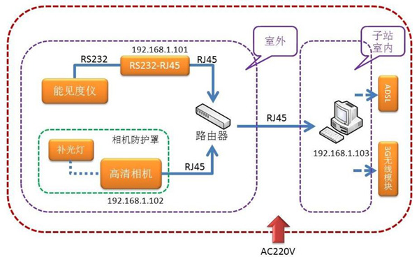 能見度可視監測系統分為室外前端設備和室內后臺監控計算機。安裝在子站室外的前端設備主要包括能見度儀和高清相機兩部分。HY-NJD1能見度儀自身是標準RS232數據接口,通過RS232-RJ45模塊可以轉換成以太網傳輸。通過路由或者交換設備連接能見度儀器、百兆網口高清相機和室內監控計算機,室內監控計算機通過IP地址可以準確定位前端設備。整個系統通訊協議采用TCP、UDP均可。后臺計算機通過FTP方式上傳或開放相關接口,可以提供向遠方更高級后臺共享該子站監測數據。