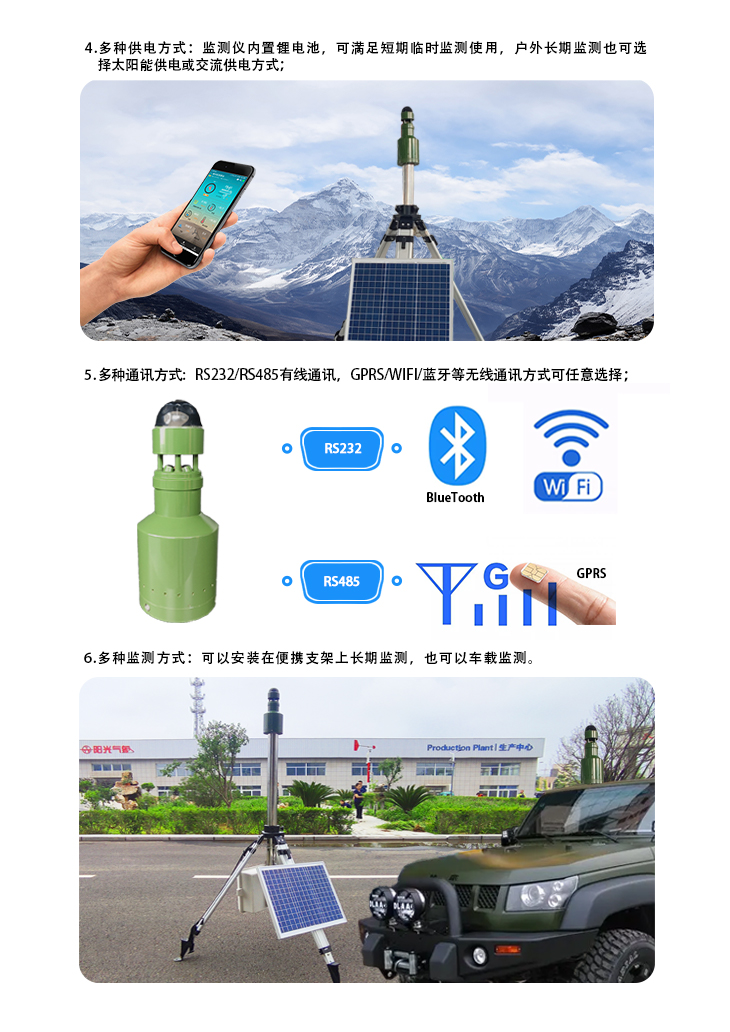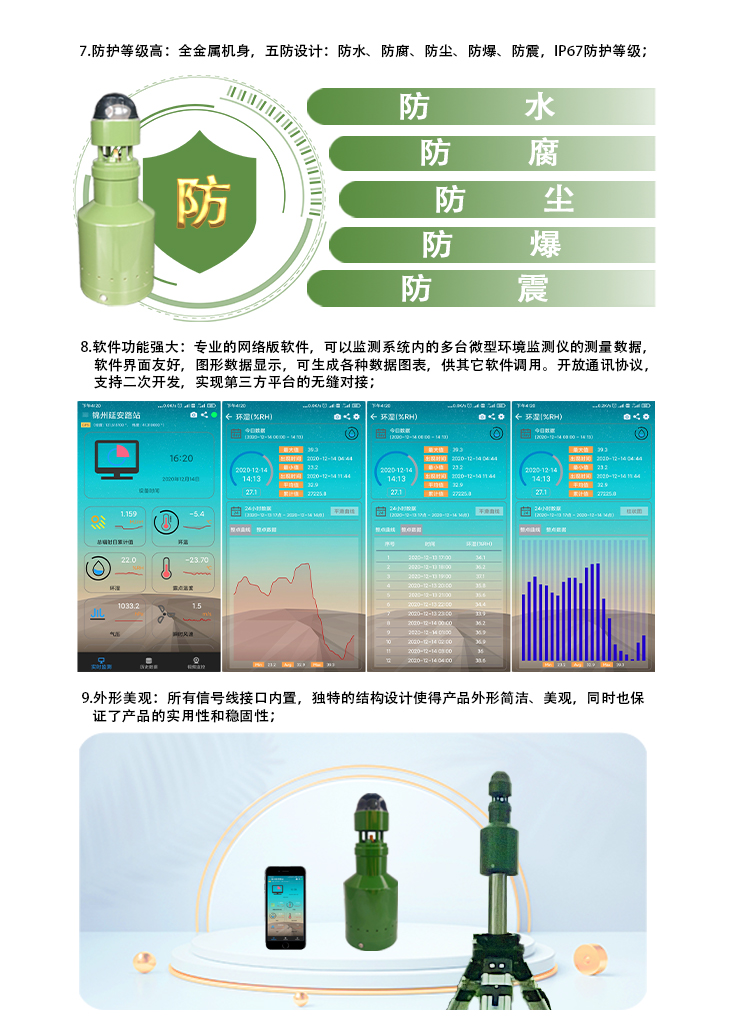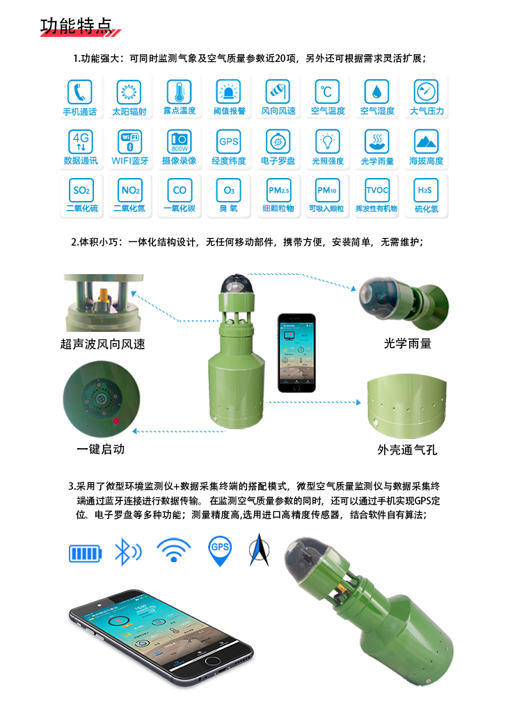 KQZL-3型微型環境監測儀是陽光氣象公司新研發的一款功能全、體積小、應用廣的小型化環境監測儀器,它采用金屬耐腐蝕材質,結構牢固、無任何移動部件、易安裝、免維護。監測要素涵蓋了氣象的七要素(溫、濕、風、壓、雨、輻射)以及空氣質量的四氣兩塵(PM2.5,PM10,CO,NO2,SO2 ,O3)等,同時可根據需要進行其他監測要素的擴展。藍牙通訊,云平臺數據管理,支持交直流供電,耗電量低,設備適用于智慧城市,智慧路燈,環境質量監測,汽車尾氣遙感監測,氣象環保,校園和研究機構等領域。