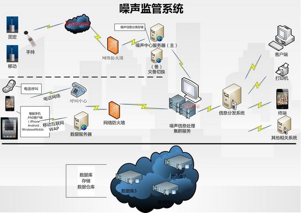 噪聲監管系統的目標是將噪聲污染源的狀態利用傳感技術、通訊技術、計算機及其網絡技術、GIS技術、信息業務處理系統有機結合而構成的新型環境噪聲監測和管理系統。系統將以GIS技術和信息業務處理系統為核心,利用在線監測終端設備(通訊方式可選擇ADSL/LAN/CDMA/GPRS/3g),把相關噪聲數據傳送到服務器。服務器端可由基于ORACLE的數據庫和基于.NET架構開發的服務端軟件組成。采用C/S與b/s結合多客戶分布式的城市噪聲監管信息化系統方式,實現對噪聲跟蹤監測,并根據遠程返回的數據,安排執法工作人員對出現的噪聲參數超標等不正常情況及時做出相應的處理,并根據噪聲的歷史數據,為管理部門決策提供相關支持。