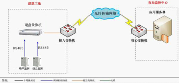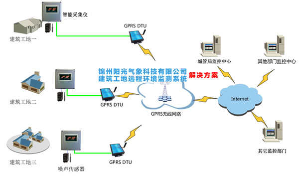 客戶需要在八個施工點實現(xiàn)遠程的噪聲、粉塵參數(shù)的監(jiān)測預(yù)警,然后通過終端傳輸設(shè)備接入到Internet網(wǎng)絡(luò)。共八個施工點需要同時監(jiān)測,全部接入到服務(wù)器機房,客戶端采用web網(wǎng)頁方式實施管理和查詢。達到實時監(jiān)控與指揮的目的。