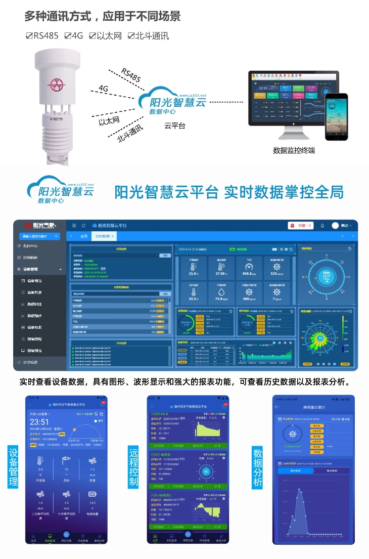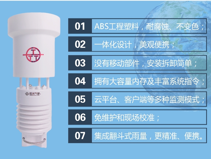 PC-8K型氣象六參數環境監測儀是我公司自主研制的一款測量多種氣象要素的一體化氣象站,可同時測量大氣溫度、大氣濕度、風速、風向、氣壓、雨量等主要氣象要素。其中雨量為高精度翻斗式雨量傳感器,其特點是精度高,響應速度快,串口輸出,方便用戶直接通過PC或外接儀器進行采集。