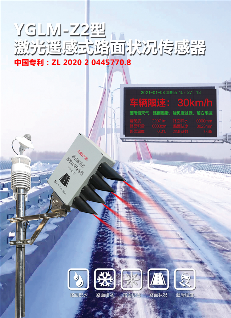 YGLM-Z2型激光遙感式路面狀況傳感器所提供的路面干、潮、濕、積雪、結冰等狀態以及路面的溫度、冰雪的厚度、濕滑的程度等都是控制交通安全的重要指標,在微量冰晶形成初期就能夠準確測量到,從而為道路狀況分析提供寶貴的早期預警。