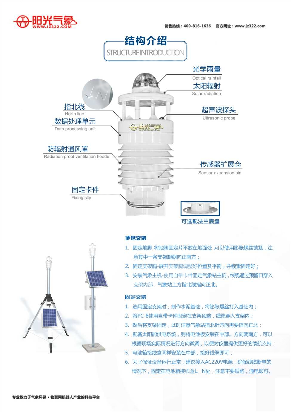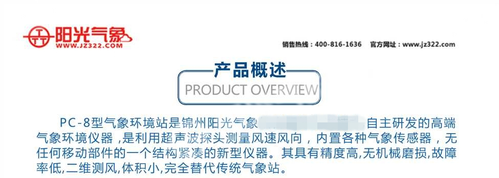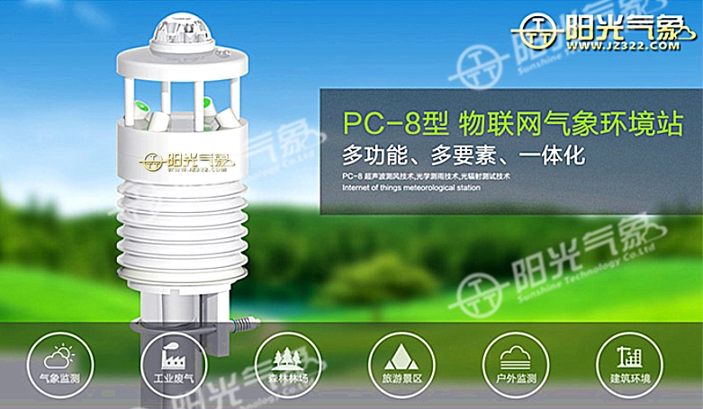 PC-8型一體化氣象站,其采用超聲波測風技術、光學測雨技術、光輻射測試技術及其它傳感技術并巧妙結合為一體的新型結構技術。又將數據采集、數據網絡通訊等功能合為一體的傳感設備。這種具有綜合氣象環境探測功能的環境站,稱為 PC-8型氣象環境站。
