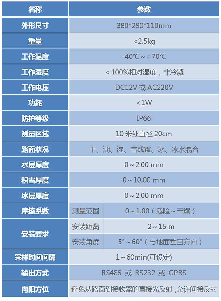YGLM-Z3型激光遙感式路面狀況傳感器所提供的路面干、潮、濕、積雪、結冰等狀態以及路面的溫度、冰雪的厚度、濕滑的程度等都是控制交通安全的重要指標,在微量冰晶形成初期就能夠準確測量到,從而為道路狀況分析提供寶貴的早期預警。