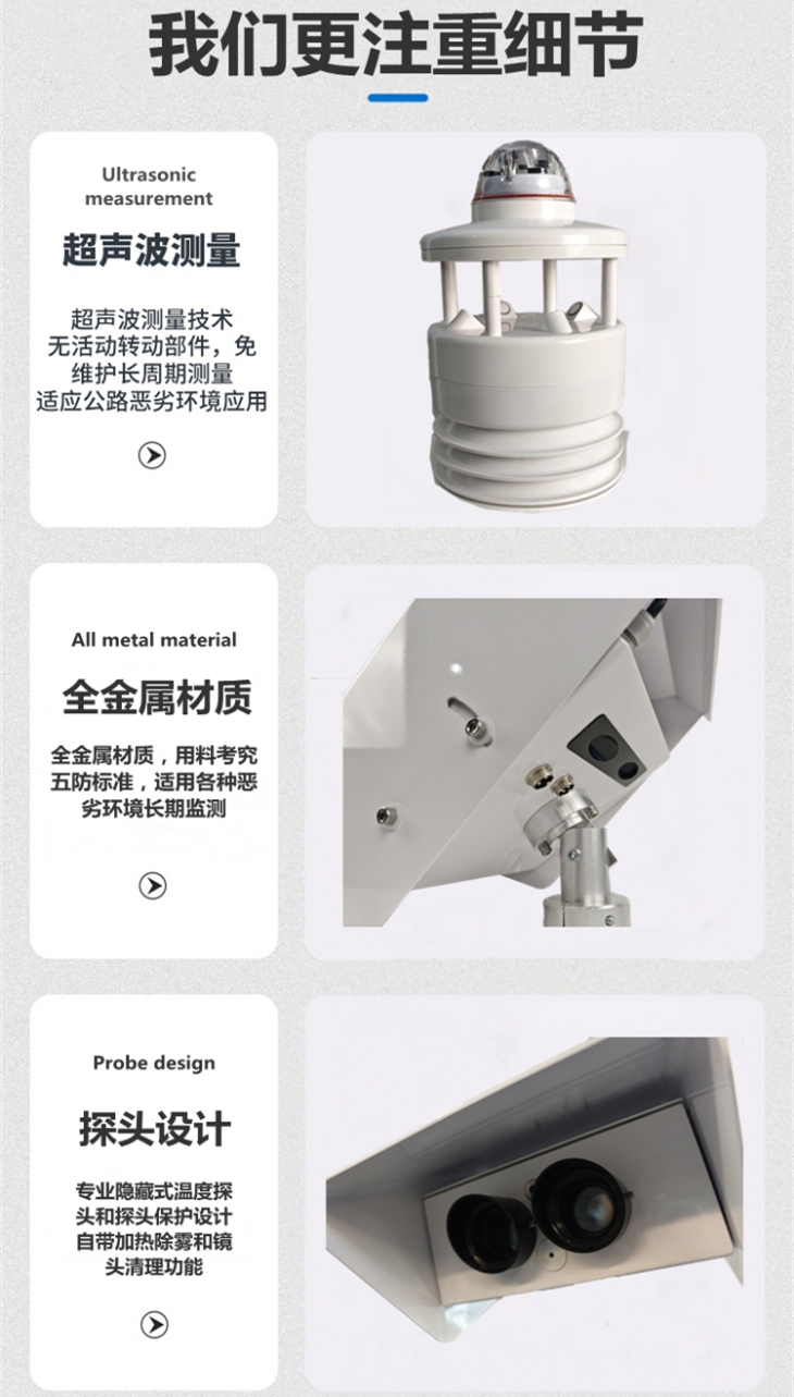 1、滿足能見度、路面狀況、路面溫度等公路交通安全高敏感氣象要素同步監測的同時兼具常規氣溫、相對濕度、風速、風向、降雨強度(等級)等常規要素的監測。