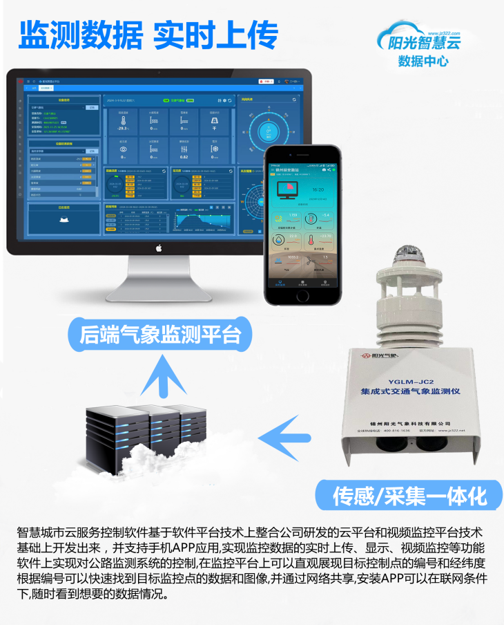 YGLM-JC2集成式交通氣象監測儀主要是利用嵌入式技術、光學技術、數字電子技術等技術對多種傳感器從結構到系統組成進行集成 化應用。能夠同時監測氣溫、相對濕度、風速、風向、降雨、路面狀況(干、潮、濕、雪、冰、冰水混合物等狀態)、路面溫度、能見度等。采用微控單元,在底層電路板將多種傳感器和多種通訊手段集成一體。是專為公路交通應用場景設計的新一代交通氣象監測設備。