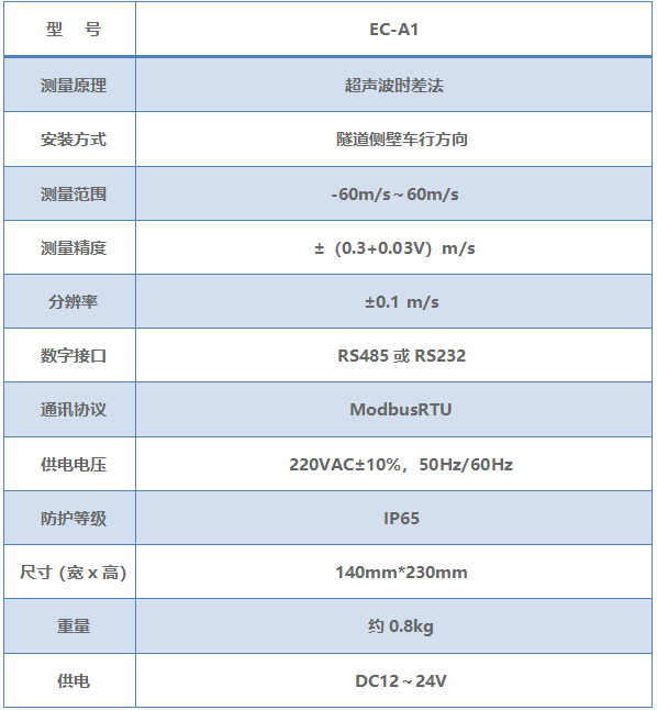 EC-A1型隧道風速風向檢測器是特別為隧道內在線監測風速和風向而設計和制造的,采用超聲波時差法原理得出隧道內的風速和風向值。檢測探頭安裝在隧道墻壁上,為隧道總控室提供隧道內風速 、風向檢測值,作為通風和營運的基本依據。檢測器可以現場實時觀測儀器運行狀態及檢測數據,同時數據輸出接口輸出的模擬和開關量信號可接入附近的分控室內地PLC,再通過數據光端機和光纖接入總控室。