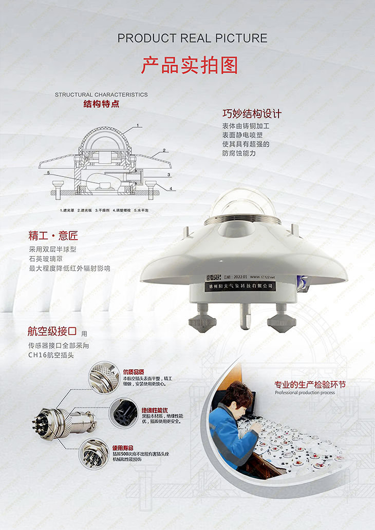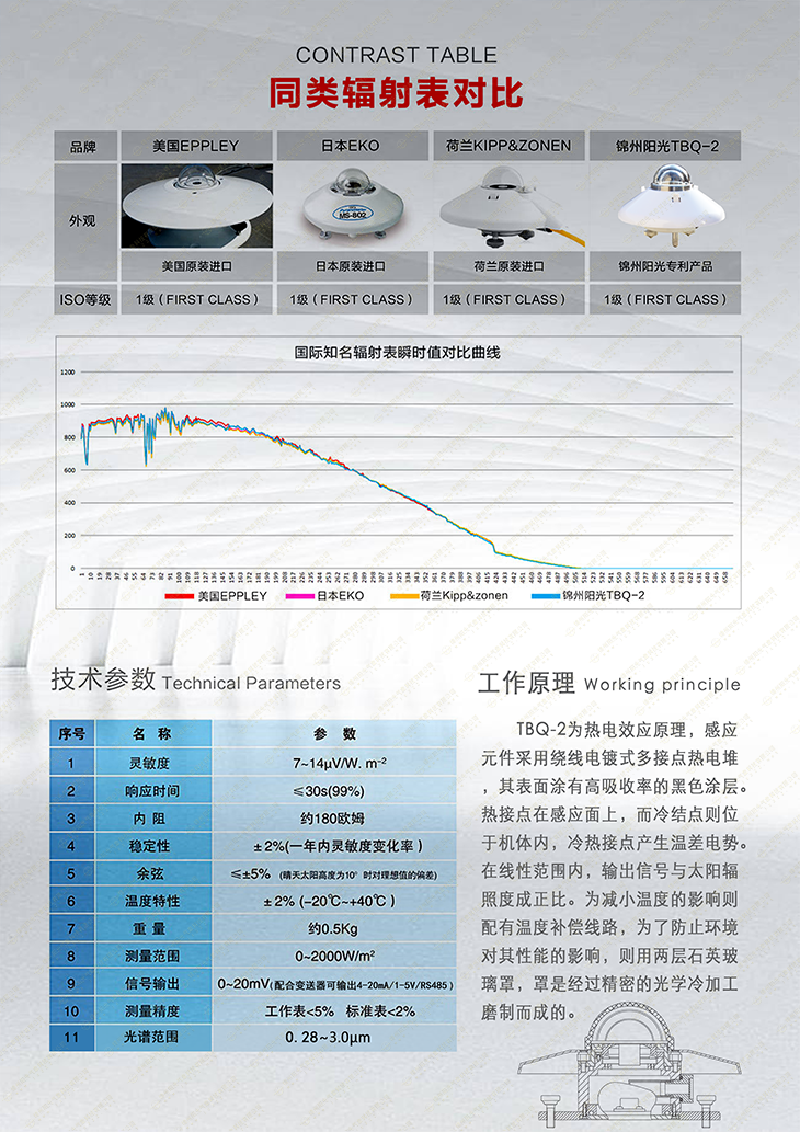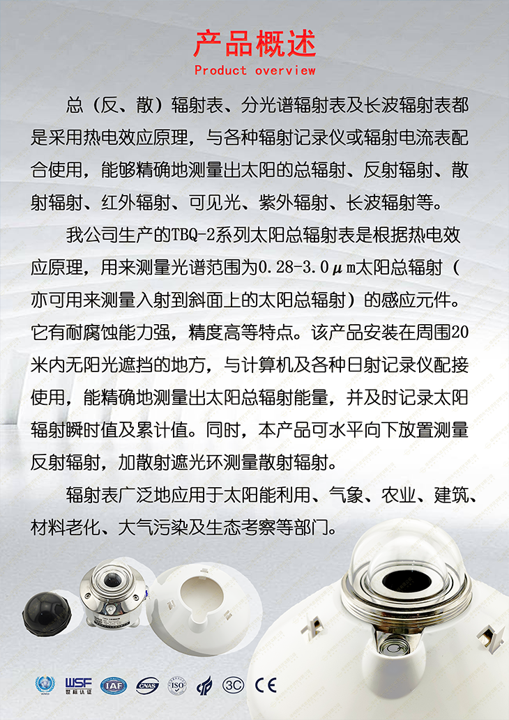 我公司生產(chǎn)的TBQ-2太陽總輻射表是根據(jù)熱電效應(yīng)原理,用來測量光譜范圍為0.28-3.0μm太陽總輻射(亦可用來測量入射到斜面上的太陽總輻射)的感應(yīng)元件。它有耐腐蝕能力強,精度高等特點。