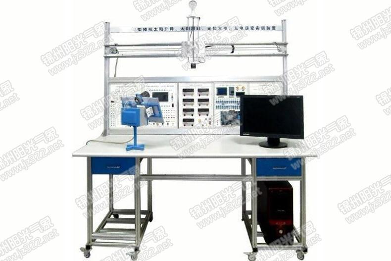 YG-JXST04型小型模擬太陽升降、太陽跟蹤、光伏發電、充電逆變實訓裝置用200W節能燈模擬太陽,模擬太陽可以左右移動1180mm,上下620mm到810mm米之間,模擬太陽的弧線升降的全過程,而且模擬太陽升降的時間可以根據實驗需要來改變的新能源教學設備。太陽跟蹤系統對模擬太陽的移動進行跟蹤,太陽跟蹤系統上的光伏發電裝置在模擬太陽光下發電,并對蓄電池進行充電,逆變裝置對蓄電池的直流電進行逆變,產生220V交流電,并給負載供電。